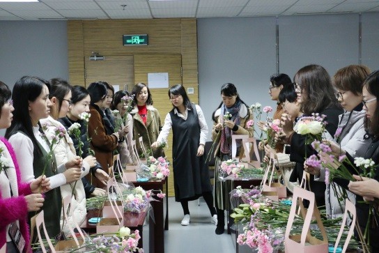 活動(dòng)中,女職工們積極參加?;ㄋ嚺嘤?xùn)老師首先對(duì)花藝?yán)碚撝R(shí)進(jìn)行了簡(jiǎn)單介紹,包括插花的特點(diǎn),有時(shí)間性,生命性,時(shí)尚性,裝飾性等。